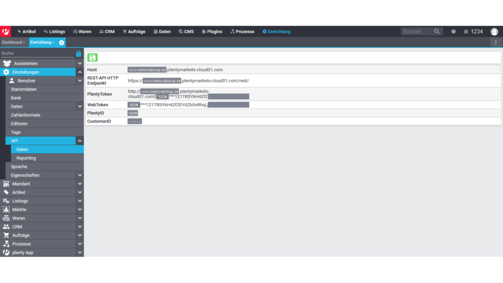 Die Plenty ID "1234" und die Subdomain "www.meinwebshop.de" dienen hier als Beispiele und sind durch die eigenen Daten zu erstezen.