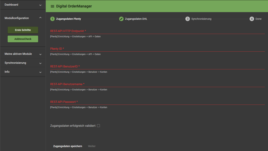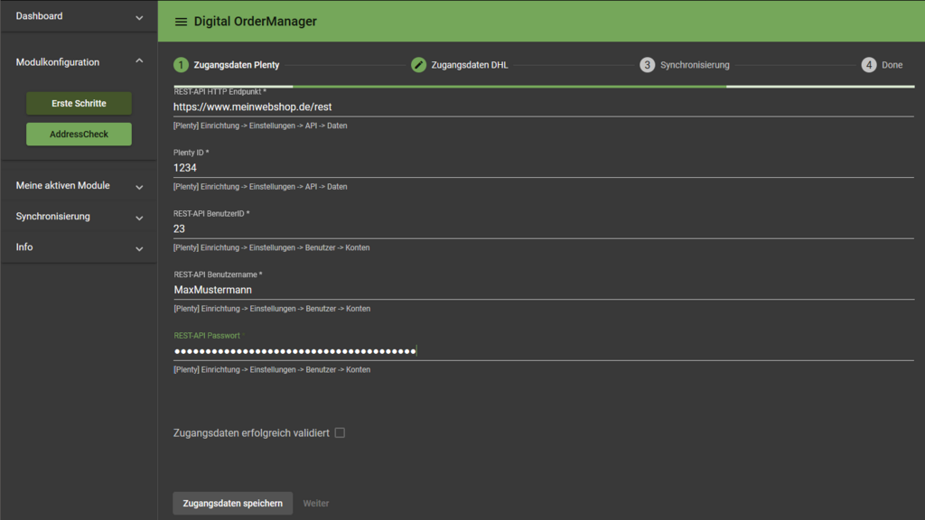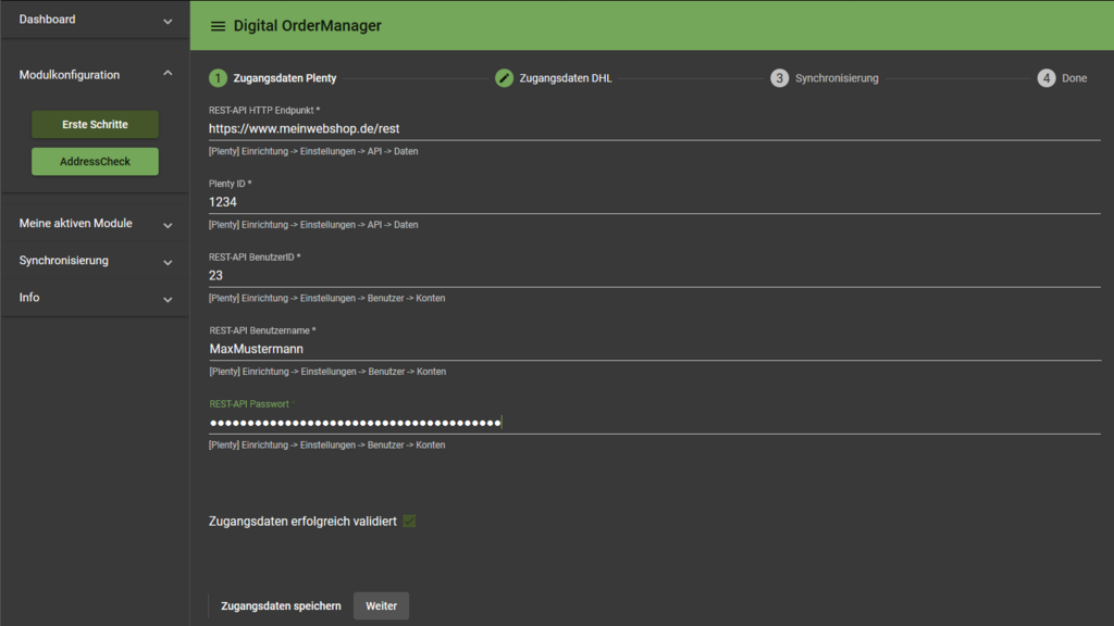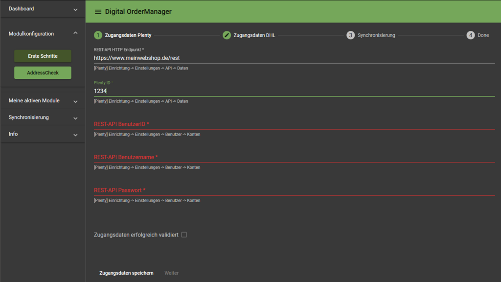 Dazu benötigt der DigitalOrderManager Zugriff und damit die Logindaten eines gültigen "Schnittstellen Users" im Plentymarkets System.
