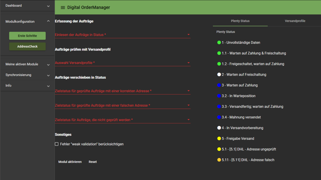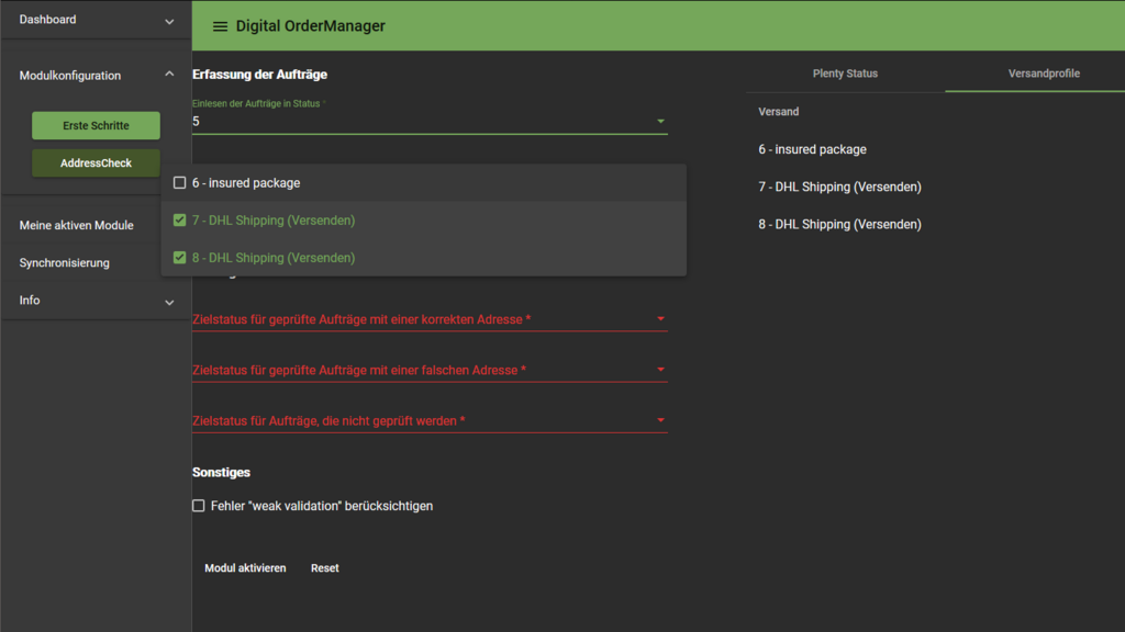 Es kann sinnvoll sein für die Konfiguration des AdressCheck weitere Versandprofile, b.z.w. weitere Status "passend zu der jeweiligen Konfiguration " im Plentymarkets System anzulegen und eine manuelle Synchronisierung durchzuführen.