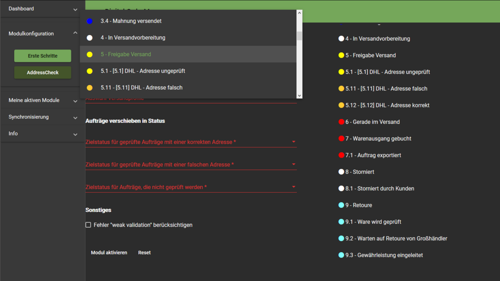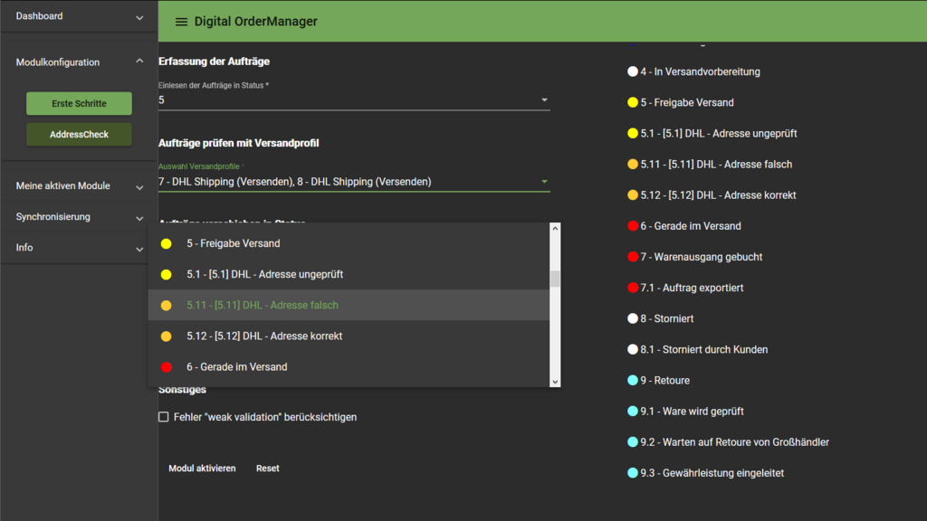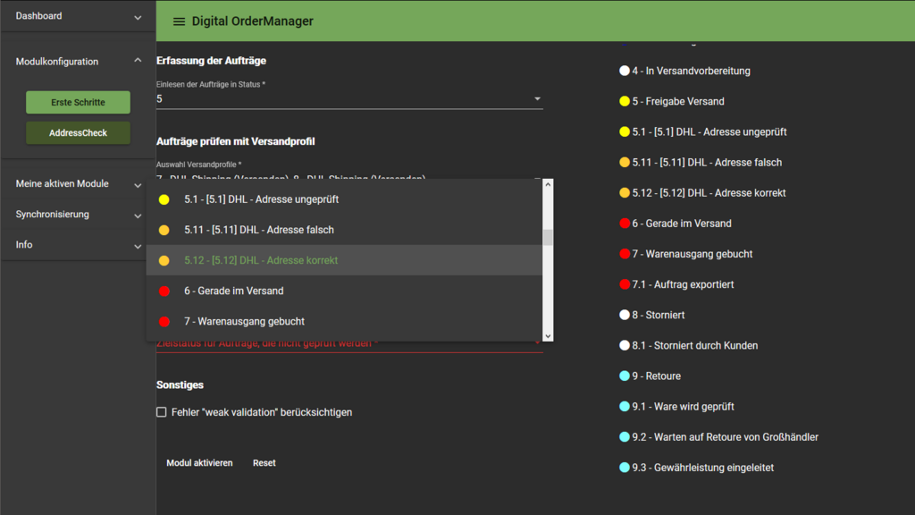 Zielstatus für geprüfte Aufträge mit einer korrekten Adresse, legt das Ziel für Aufträge fest die nicht durch die Validierung bemängelt werden und sollten (für den DHL Versand) unproblematisch sein.